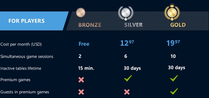 Player Gold is the highest player plan at Tabletopia and provides full access to the games catalog. The player with Gold membership can create and participate in all published games and can invite guests without premium membership to premium games. Please read more about our membership plans here.